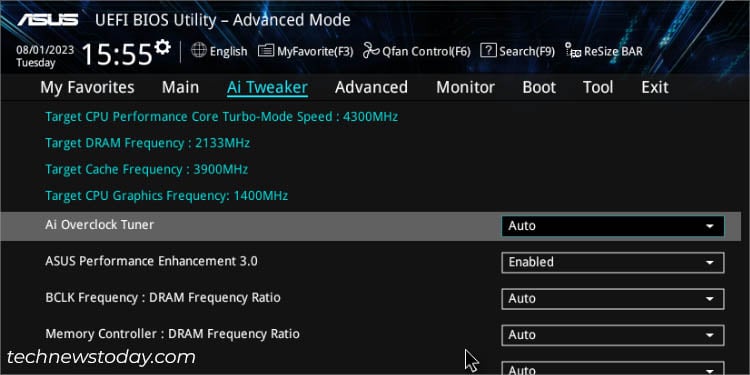 Dalla scheda”Principale”, passa ad Avanzate . Proprio sotto le frequenze CPU, grafica, DRAM e cache di destinazione, dovresti trovare Ai Overclock Tuner.