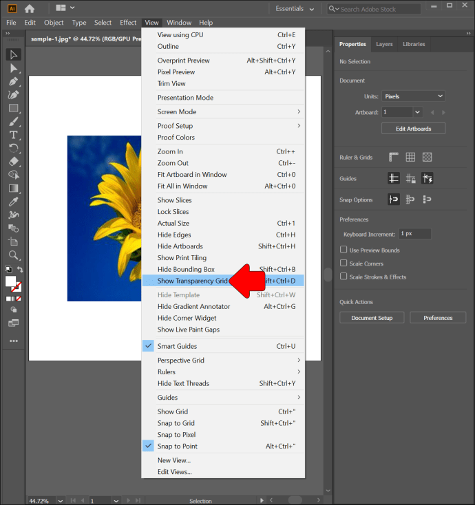 Premi la scorciatoia da tastiera Ctrl + Maiusc + D se sei un utente Windows. Se esegui Illustrator sul tuo Mac, usa invece Cmd + Maiusc + D. Questo mostra la tua griglia di trasparenza, permettendoti di determinare se lo sfondo della tua immagine è trasparente o meno.