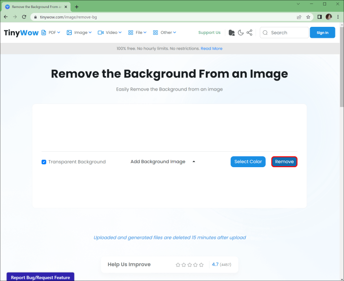 TinyWow è una piattaforma adatta ai principianti che ti consente di apportare ogni tipo di modifica alle tue immagini di Illustrator. La rimozione dello sfondo è una delle funzionalità più utili. Richiede solo pochi clic.