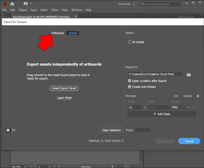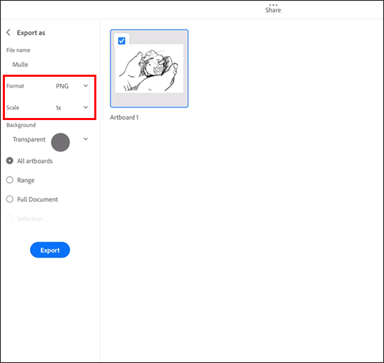 Vai a File e premi Esporta. Scegli l’opzione che ti consente di esportare il file per gli schermi. Premi il pulsante Tavole da disegno. Se nell’immagine sono presenti più tavole da disegno, seleziona quella che desideri produrre.