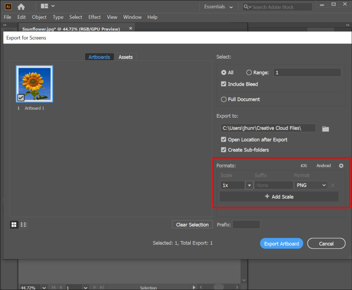 Tocca Formati e seleziona PNG come formato. La Scala dovrebbe essere 1x.
