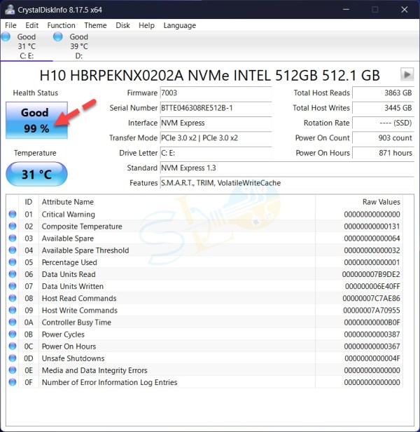 Scarica CrystalDiskInfo . Avvia CrystalDiskInfo. Come puoi vedere, la nostra percentuale di salute dell’SSD è 99.