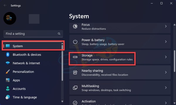 2. Seleziona Sistema dal riquadro di sinistra e fai clic su Archiviazione.