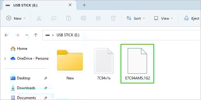 Su un altro sistema, scarica un file di aggiornamento del BIOS dalla pagina di supporto della scheda MSI. Assicurati di scaricare un file adatto (versione e revisione esatte della scheda; non dovrebbe essere necessario eseguire il flashing delle versioni precedenti prima di eseguire l’aggiornamento a questa e così via). Formatta un’unità USB su FAT32 e sposta il file BIOS su questa unità.