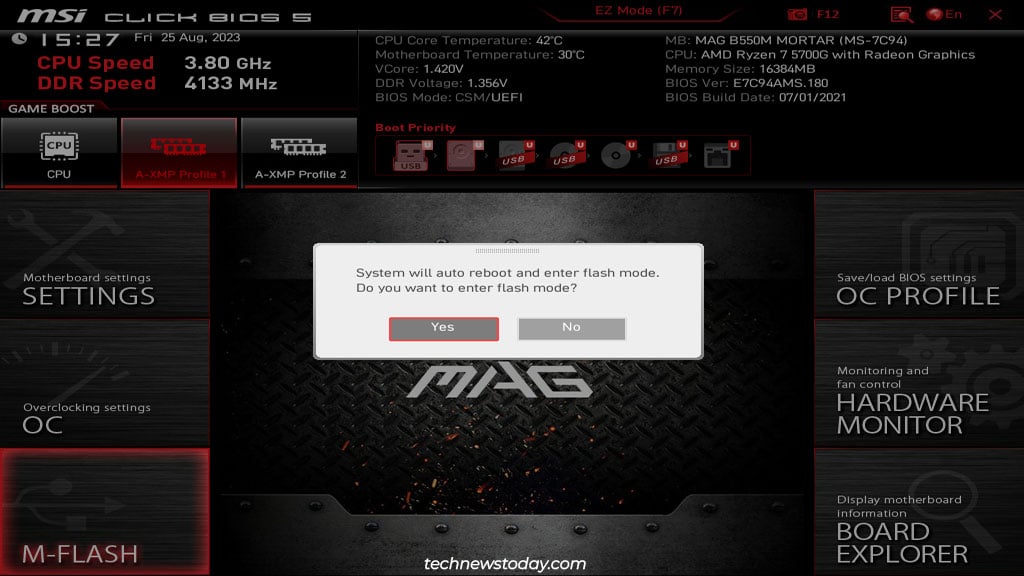Utilizza un altro sistema per scaricare un file di aggiornamento del BIOS. Spostalo su un’unità USB FAT32, come spiegato nella sezione precedente. Collega l’unità USB al tuo sistema MSI. Premi il pulsante di accensione e premi ripetutamente Canc per accedere al BIOS MSI. Seleziona M-FLASH e riavvia per accedere alla modalità Flash.