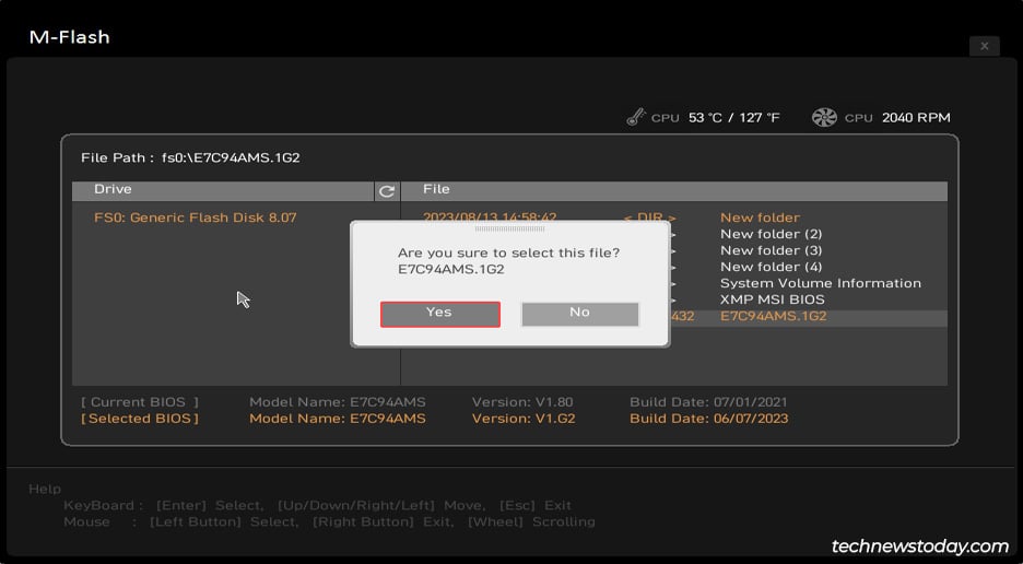 Seleziona qui il file di aggiornamento del BIOS dall’USB ma non premere ancora Sì.