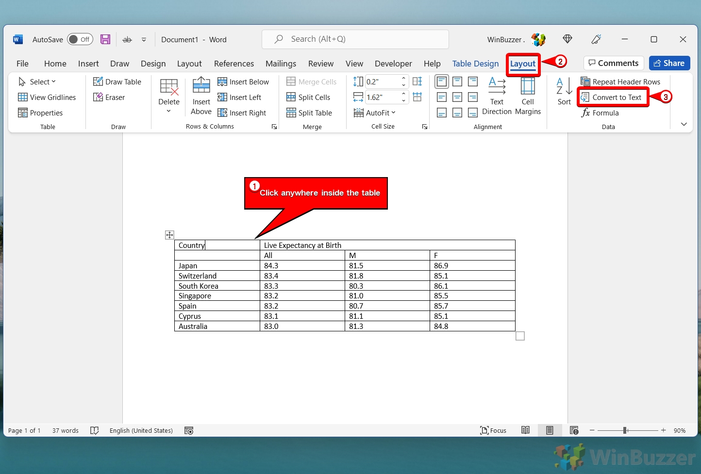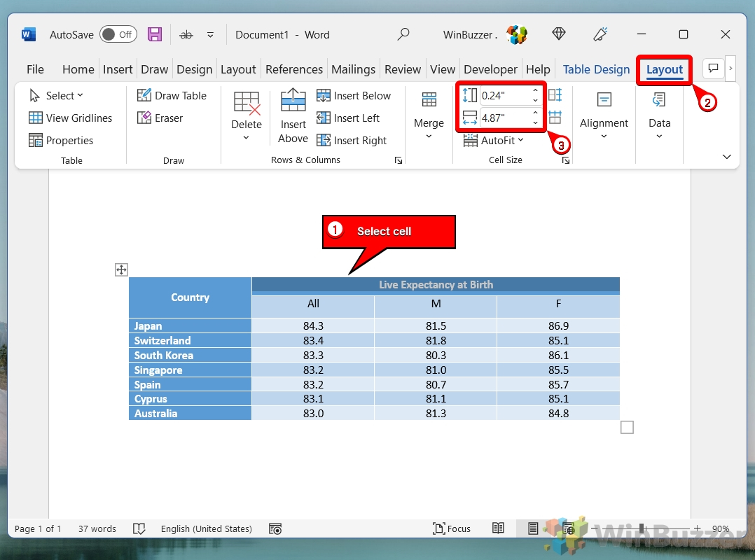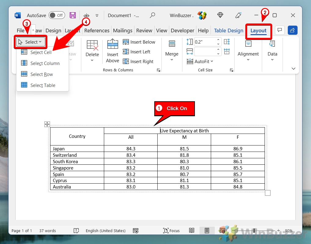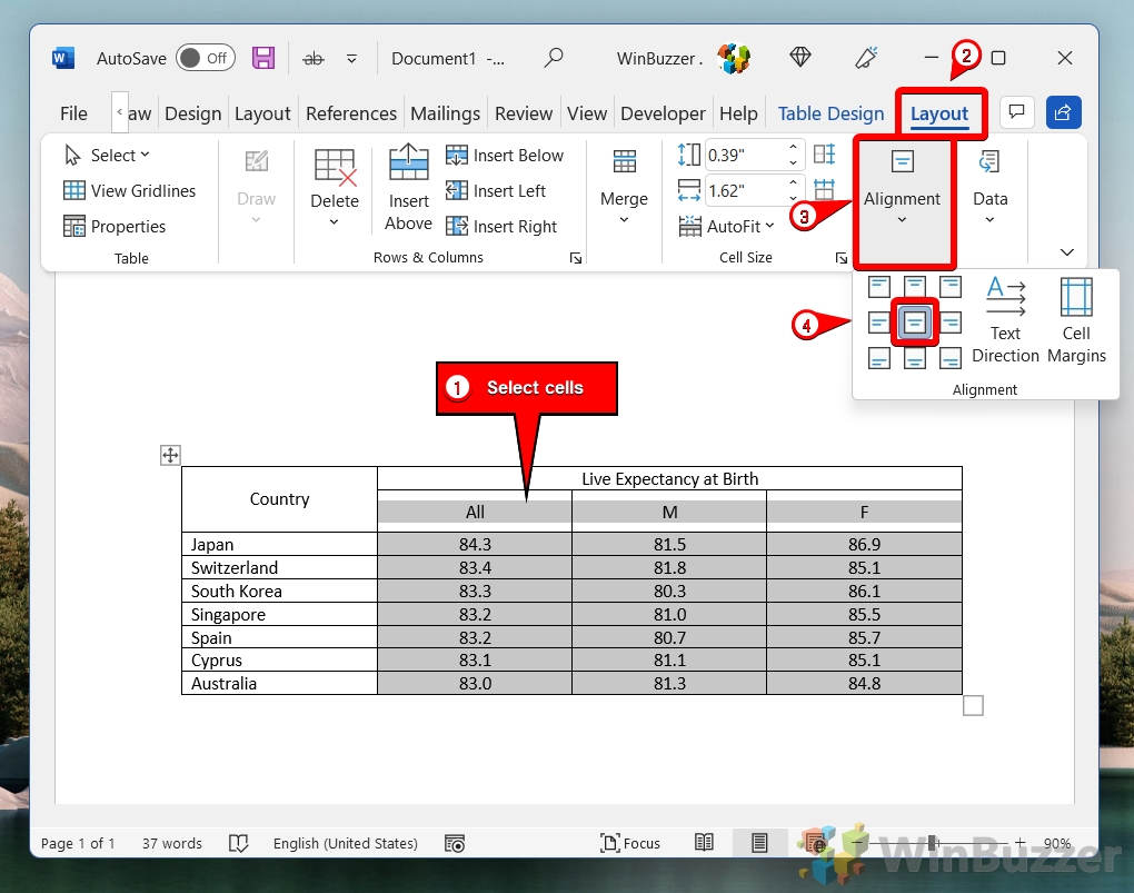 Dopo la selezione, vai alla scheda ‘Layout’ sotto ‘Strumenti tabella’ in Word nastro. Questa scheda diventa disponibile quando viene selezionata una tabella o una cella all’interno di una tabella. Scegli l’allineamento del testo