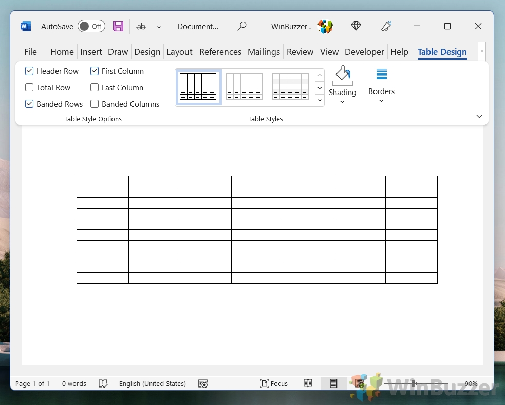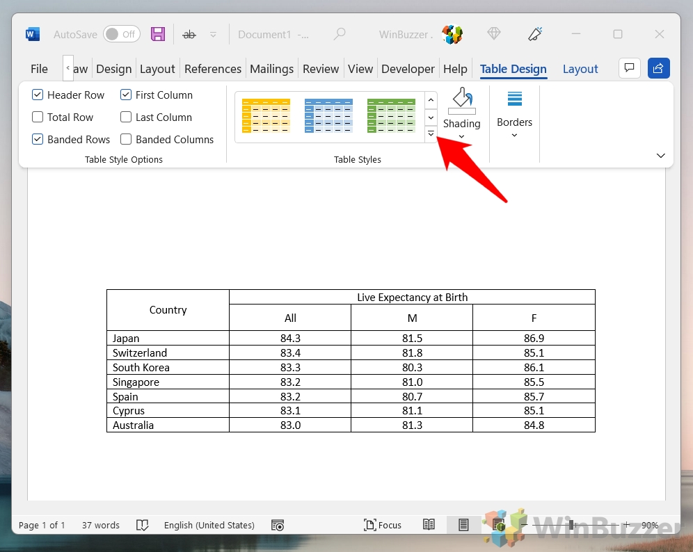 Fai clic sulla tabella che desideri modificare. Puoi selezionare l’intera tabella spostando il cursore nell’angolo in alto a sinistra della tabella finché non viene visualizzata una piccola casella con una freccia diagonale, quindi fai clic per selezionare l’intera tabella. Una volta visualizzata la tabella è selezionato, vai alla scheda “Progettazione” in “Strumenti tabella” nella barra multifunzione di Word. Questa scheda fornisce varie opzioni per definire lo stile della tabella.