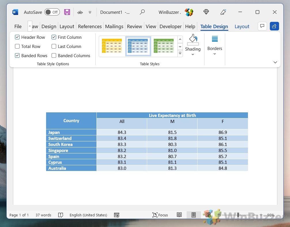 Una volta effettuata la selezione (che si tratti dell’intera tabella, specifica celle, una colonna o una riga), puoi iniziare la formattazione. Utilizza gli “Strumenti tabella” visualizzati nella barra multifunzione quando la tabella è selezionata, in particolare le schede “Design” e “Layout”, per regolare l’allineamento, applicare stili, modificare colori e altro ancora.