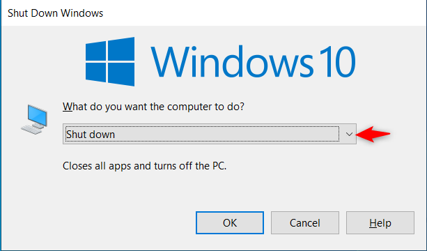 Questa azione apre la finestra Spegni Windows. Qui, l’opzione predefinita visualizzata è Spegni Windows 10. Tuttavia, puoi fare clic o toccare all’interno dell’elenco a discesa per scegliere un’altra opzione.