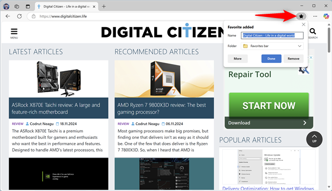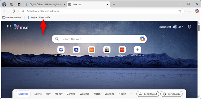 Se ce ne sono siti Web che desideri tenere a portata di mano, è facile aggiungerli all’elenco dei Preferiti in Microsoft Edge. Per iniziare, apri Microsoft Edge e visita il sito Web che desideri aggiungere. Ad esempio, potresti voler aggiungere Digital Citizen ai tuoi preferiti.