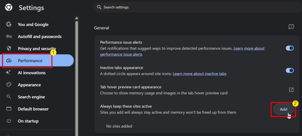 Nella scheda Impostazioni, vai alla scheda” Performance “sulla scheda laterale. Nel riquadro destro, fai clic sul pulsante” Aggiungi “accanto a”Mantieni sempre attivi questi siti”nella sezione”Generale”.