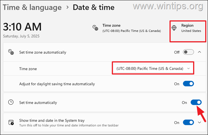 3. Vai a Start > Impostazioni > Ora e lingua > Data e ora e imposta il fuso orario corretto per la tua regione. Quindi, disattiva e riattiva l’interruttore Imposta ora automaticamente per aggiornare l’ora.