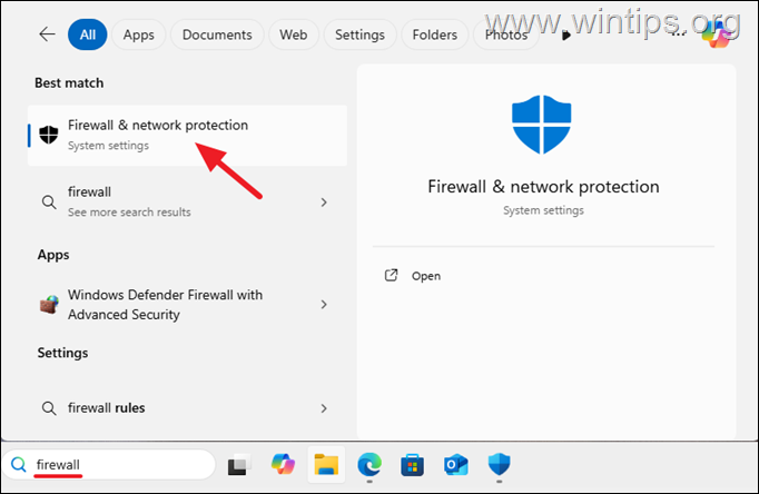 1. Digita”firewall“nella ricerca e quindi apri Protezione firewall e rete dai risultati.