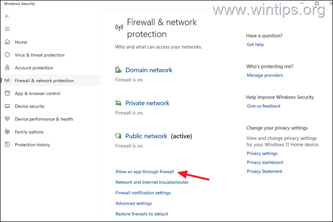 2. Nel pannello”Protezione firewall e rete”, fai clic su Consenti un’app attraverso il firewall/