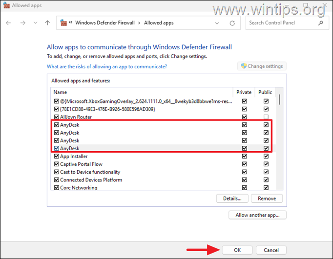 3. Qui, assicurati che AnyDesk sia autorizzato su entrambe le reti Privata e Pubblica selezionando le caselle di controllo pertinenti e quindi premi OK.