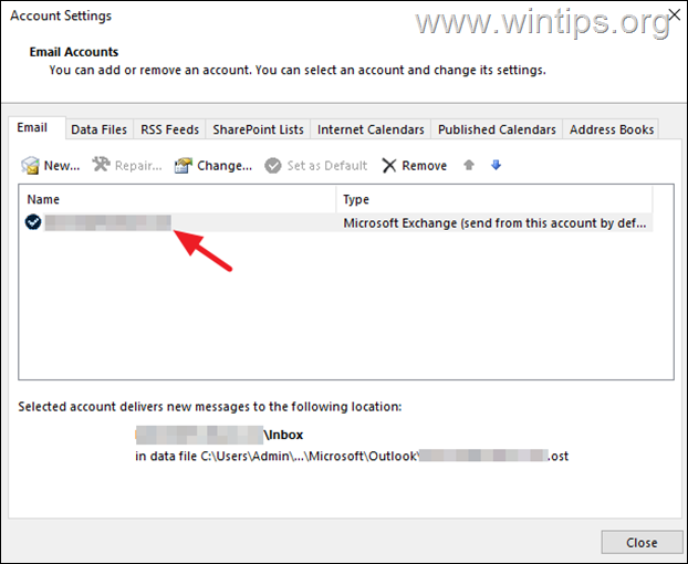 2. Nella scheda Email, fai doppio clic sul tuo Exchange Account online/Microsoft365/Office365.