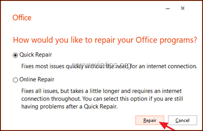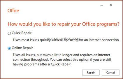 * Nota: il processo di”Riparazione online”rimuoverà e quindi reinstallerà tutte le applicazioni di Office sul tuo PC.