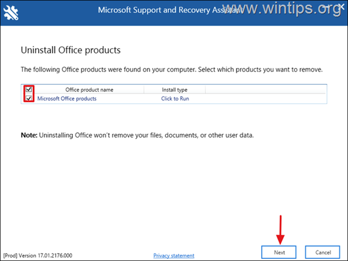 5. In Disinstalla prodotti Office, seleziona disinstallare tutti i prodotti Office e fai clic su Avanti.