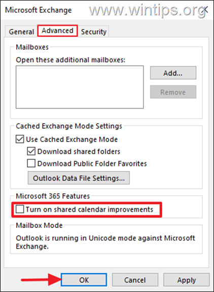 4a. Nella scheda Avanzate, deseleziona la funzione Attiva miglioramenti del calendario condiviso.