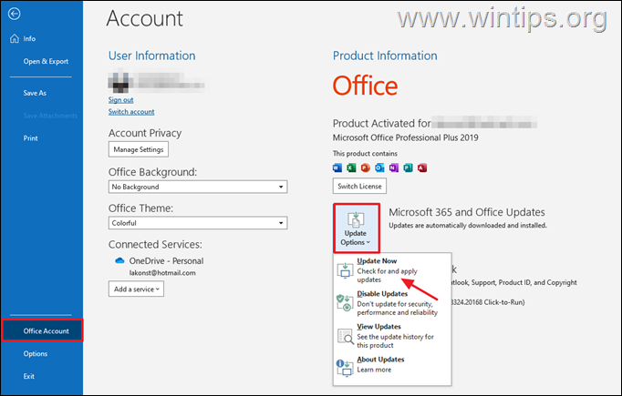 2. Fai clic su Aggiorna Opzioni, quindi fai clic su Aggiorna ora per trovare e installare gli ultimi aggiornamenti per Microsoft Outlook.