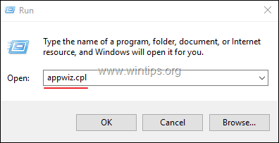 2. Nella casella Esegui comando, digita: appwiz.cpl e premi Invio.