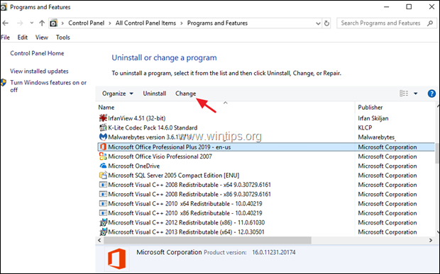 3. In Programmi e funzionalità, seleziona la versione di Office che hai installato e fai clic su Cambia.