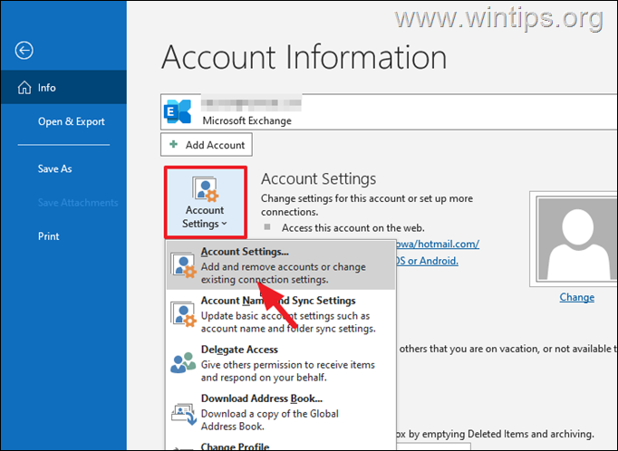 1. Dal menu File, fai clic su Impostazioni account, quindi fai nuovamente clic su Impostazioni account.
