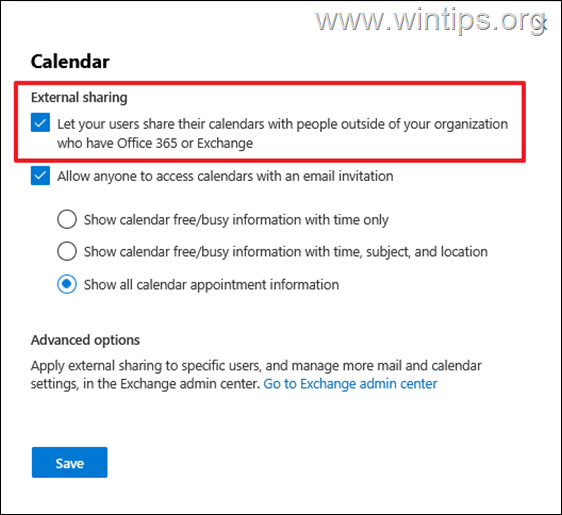 * Nota: se l’opzione”Consenti agli utenti di condividere il calendario all’esterno dell’organizzazione”è già abilitata (selezionata), disabilitala e fai clic su Salva. Quindi attendi un attimo e riattivalo.