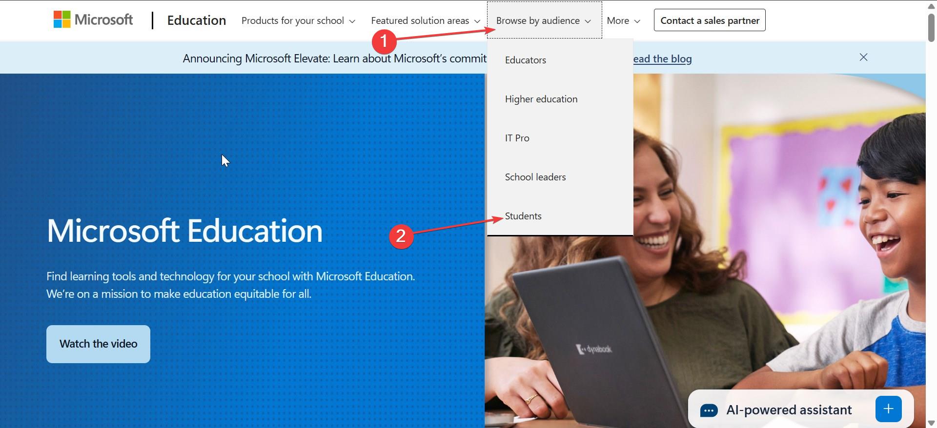 Se non disponi già di un account Microsoft, dovrai crearne uno. Nella home page, fai clic sull’opzione Sfoglia per pubblico in alto e seleziona l’opzione Studente.
