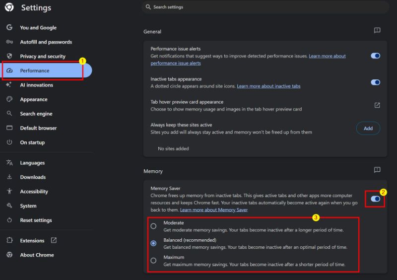 Premi il”tasto Windows“.Cerca”Google Chrome“nel menu Start e fai clic su”Apri“. Fai clic sull’icona”Menu“(tre punti verticali).Seleziona”Impostazioni“.Vai alla Scheda”Prestazioni“nella barra laterale.Attiva ON l’opzione”Risparmio memoria“.Seleziona l’opzione”Bilanciata“,”Moderata“o”Massima“a seconda di quanto vuoi che la funzione di risparmio memoria di Chrome funzioni. In questo modo, hai abilitato il risparmio memoria in Chrome.