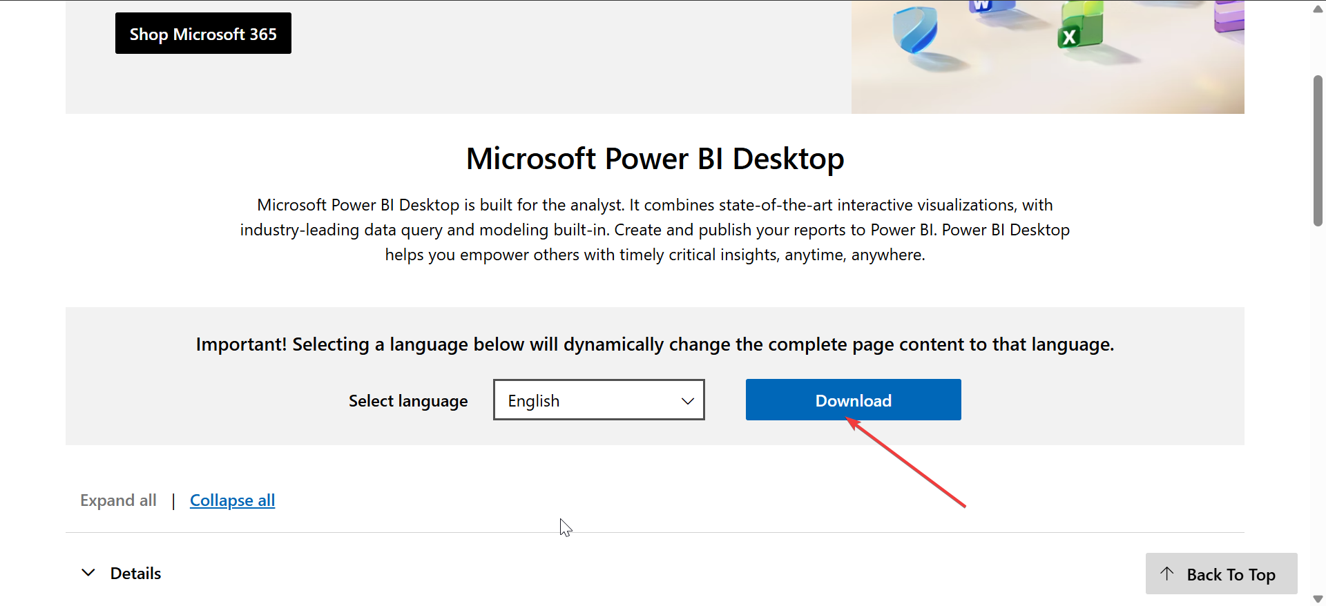 Visita https://www.microsoft.com/en-us/download/details.aspx?id=58494 per ottenere il programma di installazione di Power BI Desktop, seleziona la lingua preferita e fai clic su Scarica. Scegli tra PBIDesktopSetup_x64.exe o PBIDesktopSetup.exe (x86). Infine, esegui il file e segui i passaggi di installazione sullo schermo.