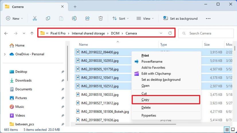 Cerca la posizione dell’immagine, ad esempio Questo PC\Pixel 6 Pro\Archiviazione condivisa interna\DCIM\Fotocamera.