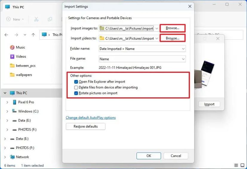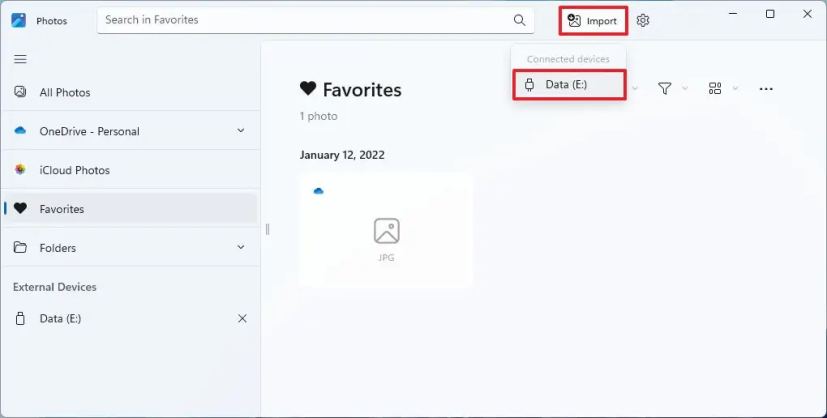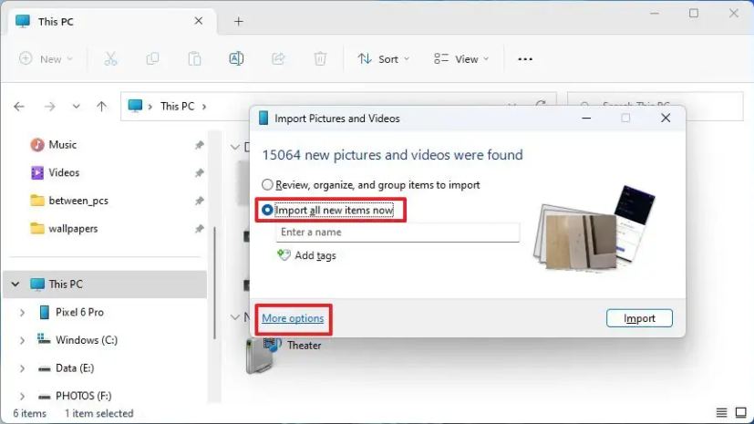 In alternativa, se hai un telefono o fotocamera, puoi trasferire tutte le foto con l’opzione di importazione Esplora file con questi passaggi: