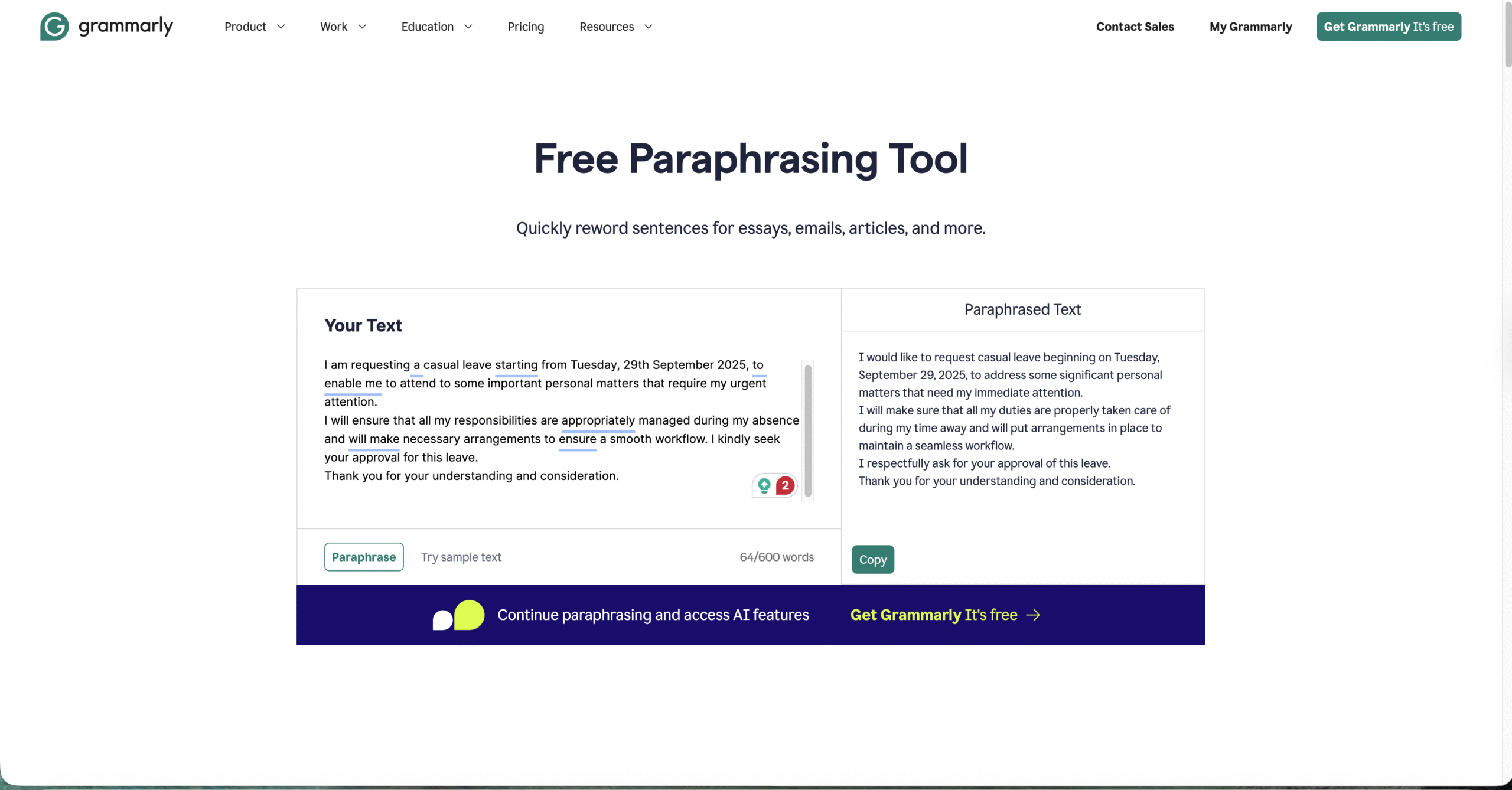 Se hai bisogno di riformulare rapidamente senza registrarti, lo strumento gratuito di parafrasi grammaticale può aiutarti. Supporta passaggi più brevi e offre più riscritture.