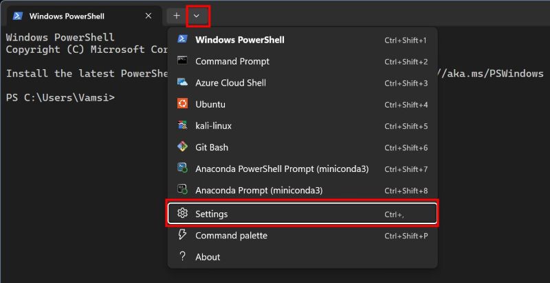 Una volta aperta la finestra del terminale, fai clic sull’icona”Freccia giù“e seleziona l’opzione”Impostazioni“. Si aprirà una nuova scheda con le impostazioni del terminale.