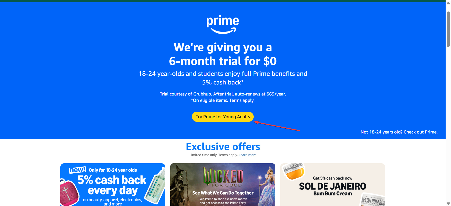 Fai clic sul pulsante Prova Prime per giovani adulti nella nuova pagina. Verrai indirizzato alla pagina di iscrizione in cui inizierai il processo di verifica.