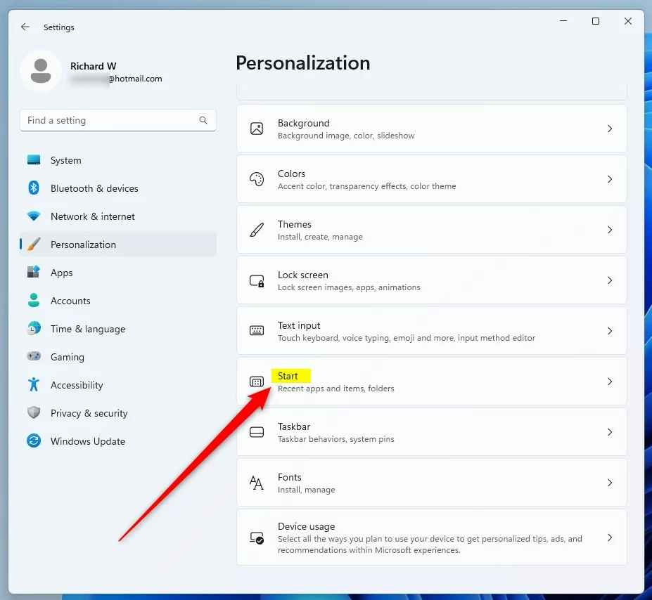 Il riquadro Impostazioni di Windows dovrebbe essere simile all’immagine qui sotto. Nell’app Impostazioni di Windows, fai clic su Personalizzazione a sinistra.