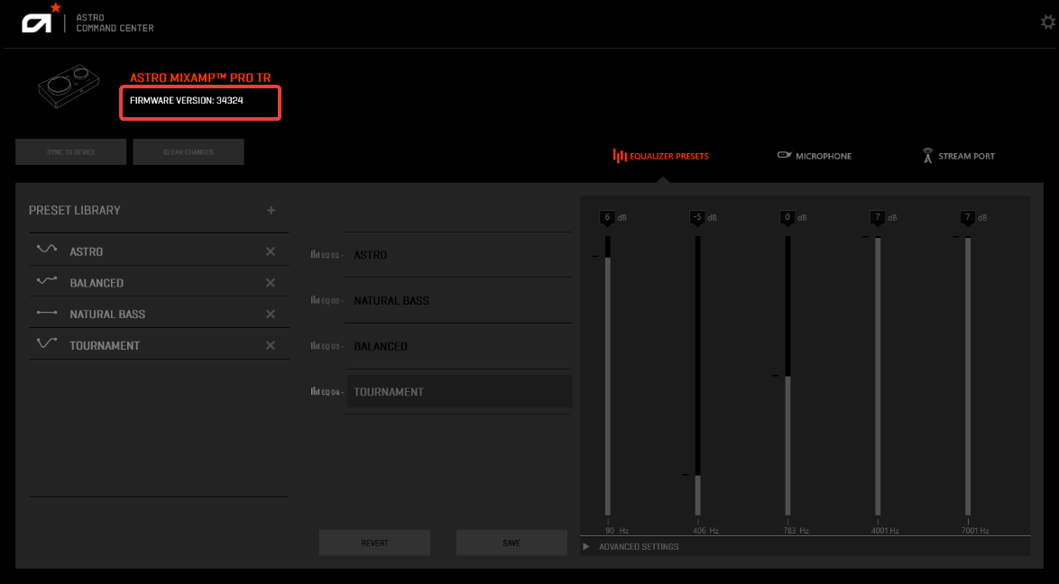 Apri Astro Command Center e individua il numero di versione del firmware sotto l’immagine del dispositivo. Confermare la tua versione aiuta a verificare un aggiornamento corretto e garantisce che sia l’auricolare che la stazione base eseguano firmware corrispondente.