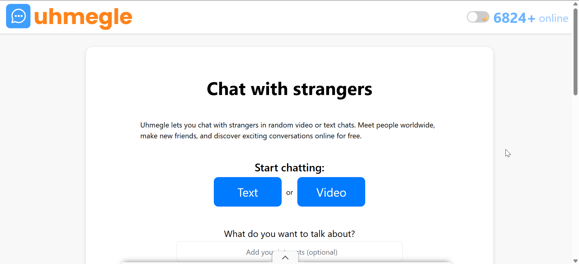 Uhmegle offre un’interfaccia pulita e un motore di corrispondenza più fluido progettato come un moderno successore di Omegle. Si concentra sull’abbinamento basato sugli interessi per offrire una migliore qualità della corrispondenza. Il suo design leggero mantiene il caricamento e il passaggio rapidi.