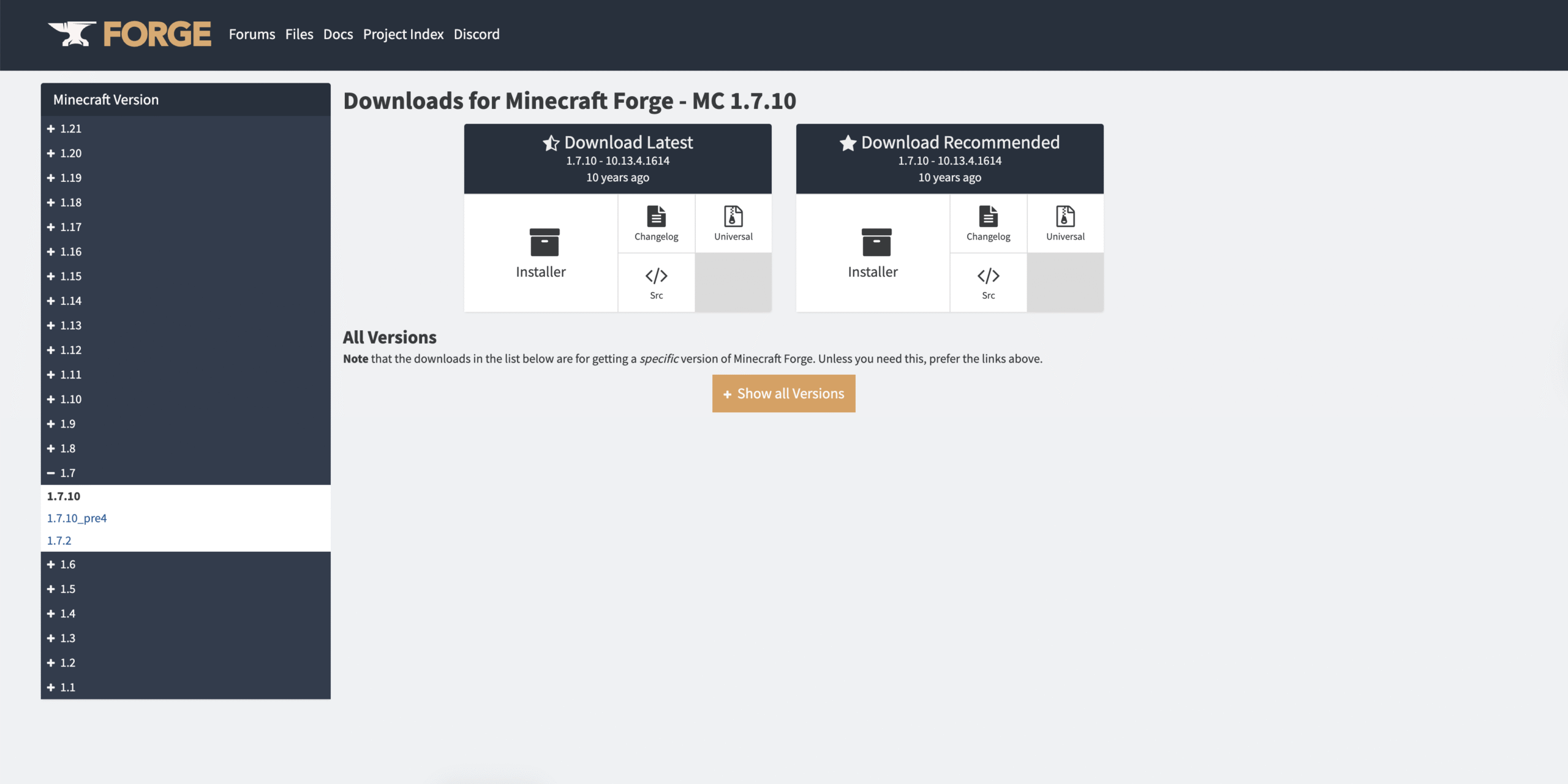 Apri il tuo browser web. Vai al sito ufficiale di Forge su files.minecraftforge.net. Cerca il menu Versione Minecraft e passa a 1.7.10 o all’elenco delle versioni precedenti.
