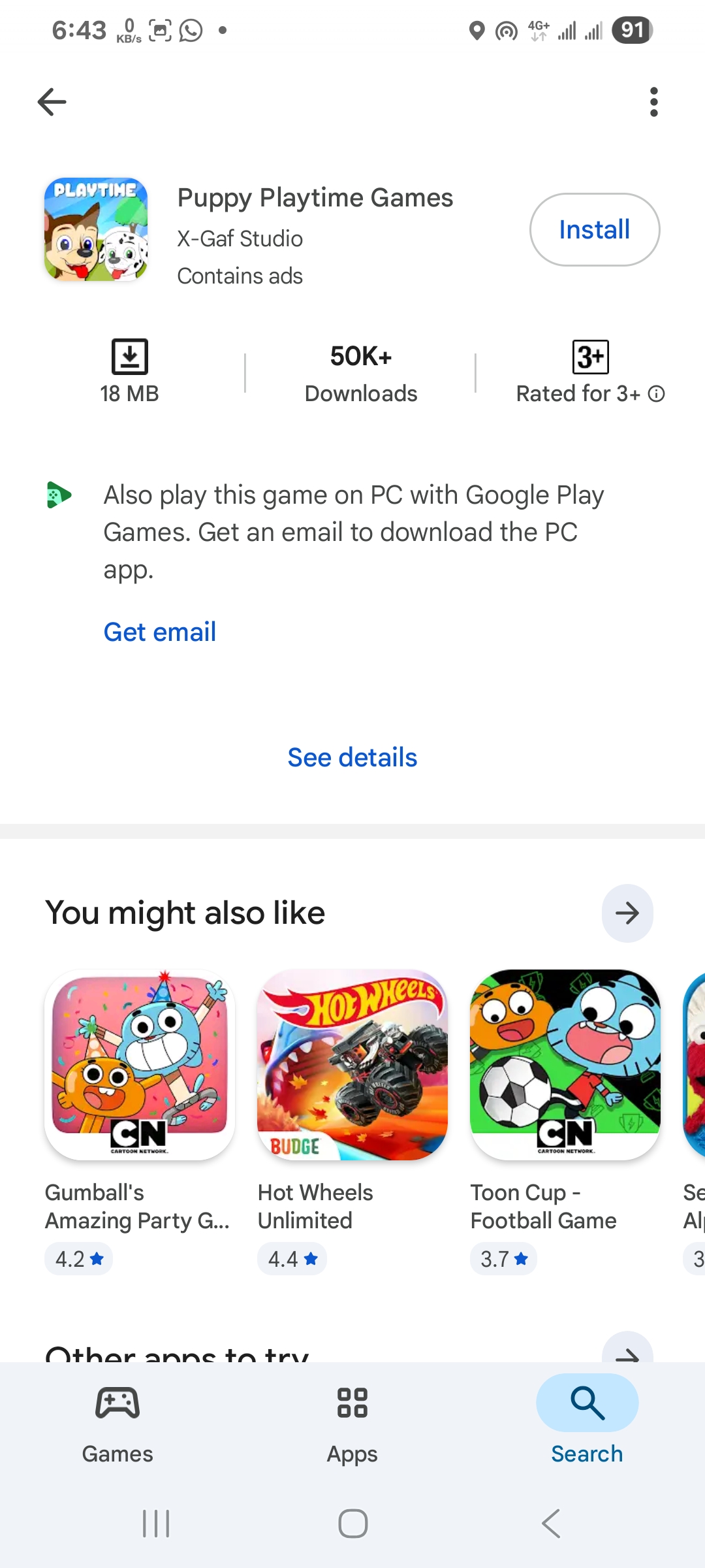 Download bloccato o molto lento: metti in pausa il download di Puppy Playtime nello store, riconnettiti a una rete Wi-Fi potente, quindi riprendi il download. Riavvia il telefono se la barra di avanzamento continua a non muoversi. Spazio di archiviazione insufficiente: elimina vecchie foto, video o app inutilizzate, quindi prova di nuovo a installare Puppy Playtime. Cerca di avere un po’più di spazio libero rispetto alle dimensioni indicate per il gioco. App non compatibile con il dispositivo: se lo store mostra un avviso di compatibilità, il tuo telefono o tablet potrebbe essere troppo vecchio. Prova un dispositivo più recente che esegue una versione più recente di Android. Il tempo di gioco del cucciolo si blocca all’avvio: forza la chiusura dell’app, riavvia il dispositivo e riapri il gioco. Se il problema persiste, aggiorna sia l’app che il software di sistema dal menu delle impostazioni. Impossibile trovare il tempo di gioco del cucciolo nello Store: controlla l’ortografia, quindi filtra i risultati per”App”. Se il gioco continua a non essere visualizzato, potrebbe non essere disponibile nella tua regione nel momento in cui scriviamo.
