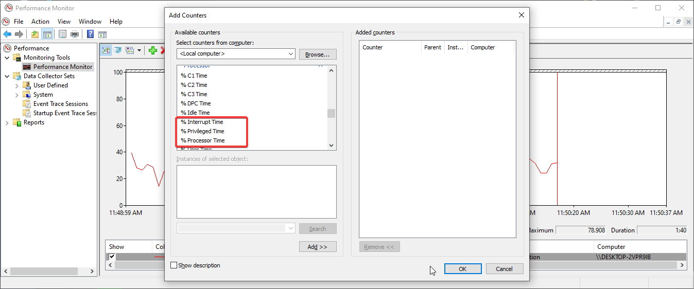 Per avviare lo strumento Performance Monitor, premi il tasto Windows + R per aprire Esegui, quindi digita perfmon e premi Invio. Successivamente, fai clic sul pulsante + e aggiungi contatori come Tempo del processore, Tempo di interruzione e % Tempo privilegiato. Infine, fai clic su OK quando hai finito.