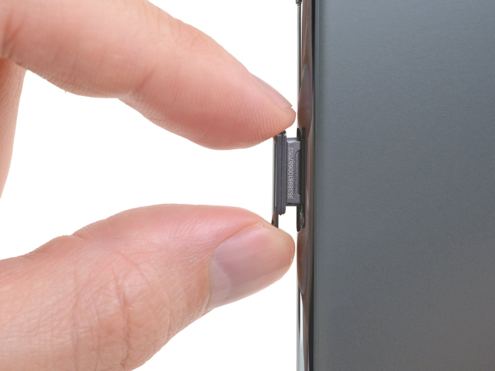 Tieni il telefono in posizione verticale e guarda lungo il lato destro. Trova il sottile contorno rettangolare e il piccolo foro stenopeico circolare. Mantieni il dispositivo spento prima di aprire il vassoio.