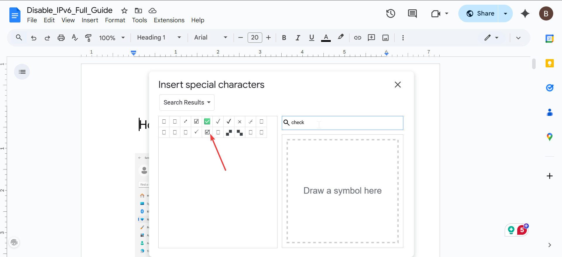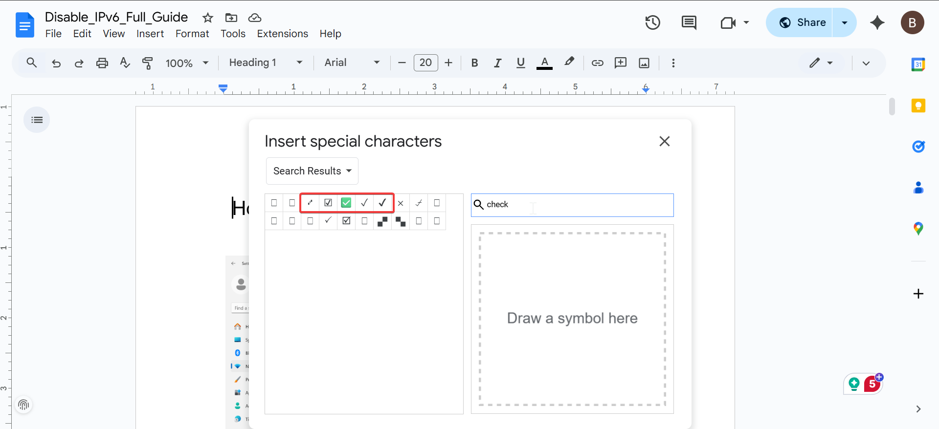 Google Documenti include uno strumento Caratteri speciali che ti consente di cercare e inserire rapidamente segni di spunta.