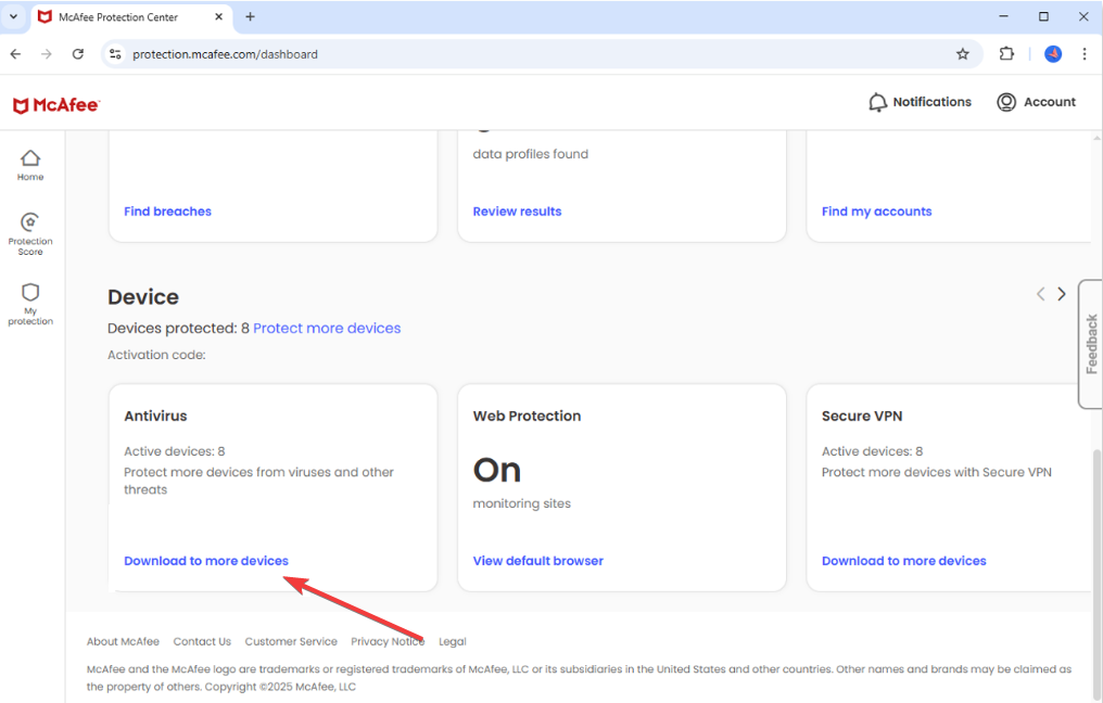 Inizia visitando il sito Web McAfee sul tuo browser e accedendo al tuo account. Successivamente, vai alla sezione Dispositivo, fai clic su Scarica su più dispositivi sotto il riquadro Antivirus e fai clic su Scarica su questo dispositivo nella schermata Aggiungi un dispositivo che desideri proteggere.