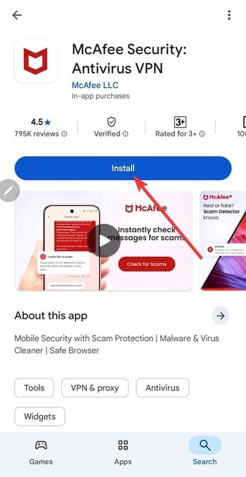 Apri Google Play Store e cerca McAfee. Successivamente, tocca Installa e attendi il completamento dell’installazione.