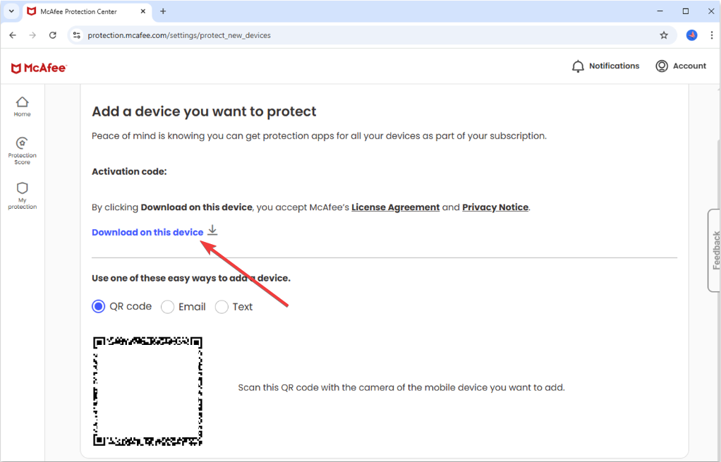Inizia visitando il sito Web McAfee sul tuo browser e accedendo al tuo account. Successivamente, vai alla sezione Dispositivo, fai clic su Scarica su più dispositivi sotto il riquadro Antivirus e fai clic su Scarica su questo dispositivo nella schermata Aggiungi un dispositivo che desideri proteggere.