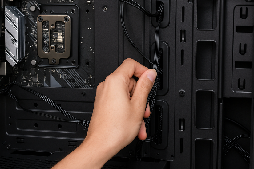 Fai passare i cavi della ventola e della pompa lungo i bordi del case o dietro il vassoio della scheda madre. Il passaggio pulito dei cavi migliora il flusso d’aria e mantiene il sistema pulito.