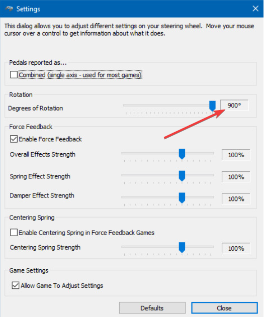 Impostare la rotazione del volante su 900 gradi a meno che il gioco non suggerisca una rotazione inferiore valore. Regola le zone morte su zero per un input più preciso a meno che non noti rumore hardware.